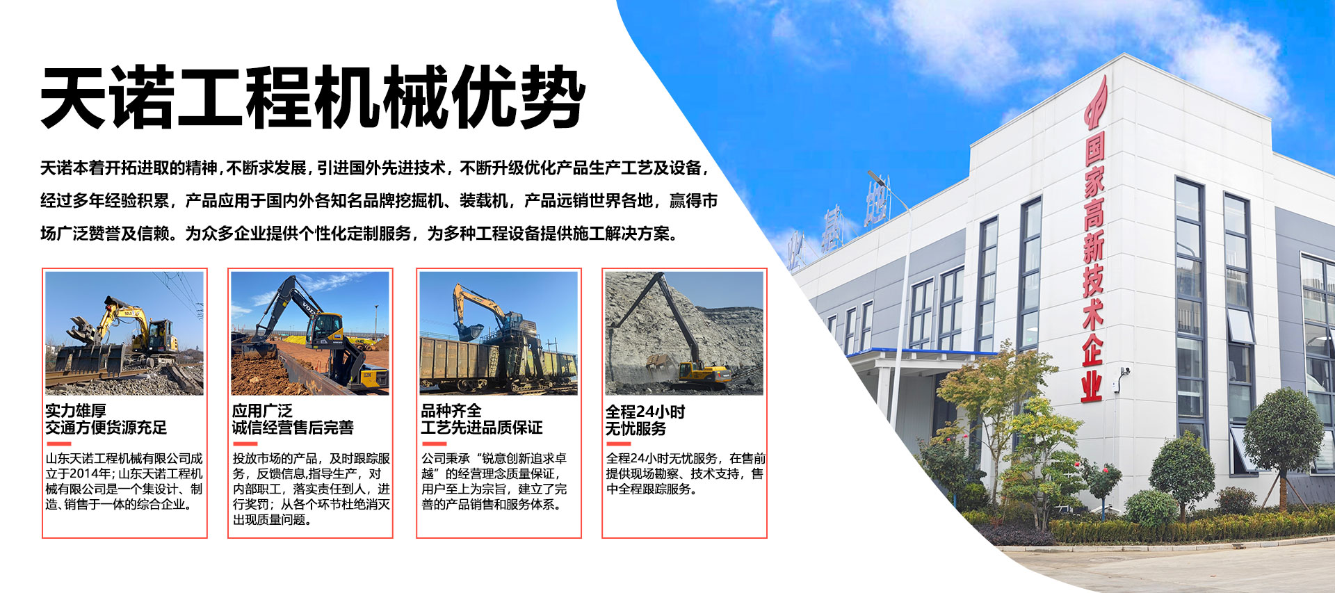 山東天諾工程機(jī)械有限公司成立于2014年;天諾工程機(jī)械是一個(gè)集設(shè)計(jì)、制造、銷(xiāo)售于一體的綜合企業(yè),生產(chǎn)產(chǎn)品適配各種工程機(jī)械設(shè)備,主要有:鐵路換枕機(jī)改裝,挖掘機(jī)升高底盤(pán),挖掘機(jī)駕駛室升降,加長(zhǎng)臂、三節(jié)臂、打樁臂、巖石臂定制,多型號(hào)挖斗鏟斗定制,裝載機(jī)防滑履帶,多種類(lèi)鐵路維護(hù)屬具等產(chǎn)品。