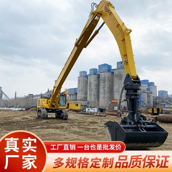 正是因為挖掘機的標準臂長度不能滿足某些工作場合,所以越來越多挖掘機都采用加長臂來填補這片空白,如深坑作業(yè)的地基工程,高空作業(yè)的樓房拆卸或河道清理等領域的建設和維護等,都必須用到加長臂才能高 效快捷地完成工程要求的各項指標。城市的不斷擴張,老舊城區(qū)的拆遷。政府出于安全的考慮,對相對較低樓層不進行爆破拆除,而選擇了三段加長臂進行拆除。三段加長臂在原有的兩段加長臂的基礎上面加了一段中臂。中臂可以在很大的程度上面能夠保護司機的安全。三段式加長臂都是帶錘或者液壓剪進行工作。